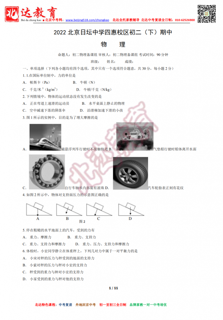 北京日坛中学四惠校区2022初二下期中物理试题及答案(高清版)。admw360中考复读学校教研组收集整理,分享给大家。
