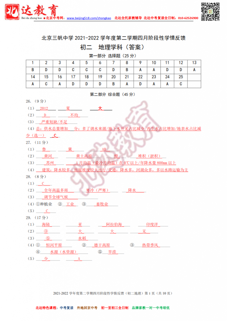 北京三帆中学2022初二下期中地理模拟试题答案(高清版)。admw360中考复读学校教研组收集整理,分享给大家。