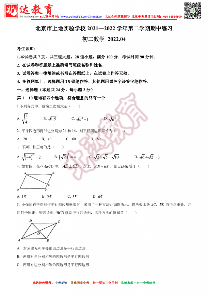 北京上地实验学校2022初二下期中数学试题及答案(高清版)。admw360中考复读学校教研组收集整理,分享给大家。