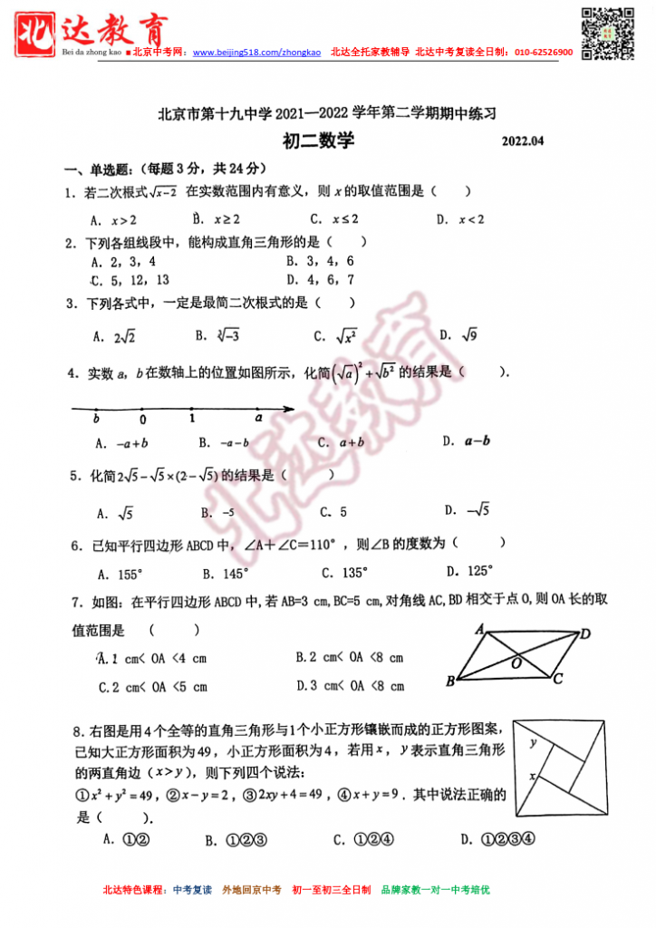 北京十九中2022初二下期中数学试卷(高清版)。admw360中考复读学校教研组收集整理,分享给大家。