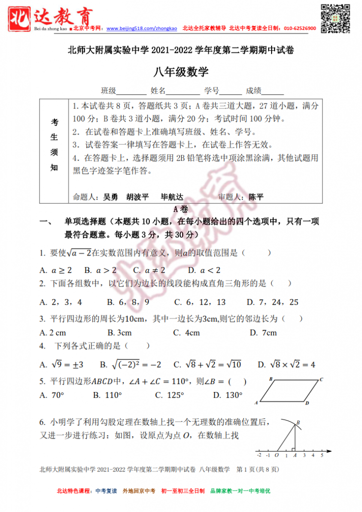 北师大附属实验中学2022初二下期中各科试卷+答案汇总。admw360中考复读学校教研组收集整理,分享给大家。