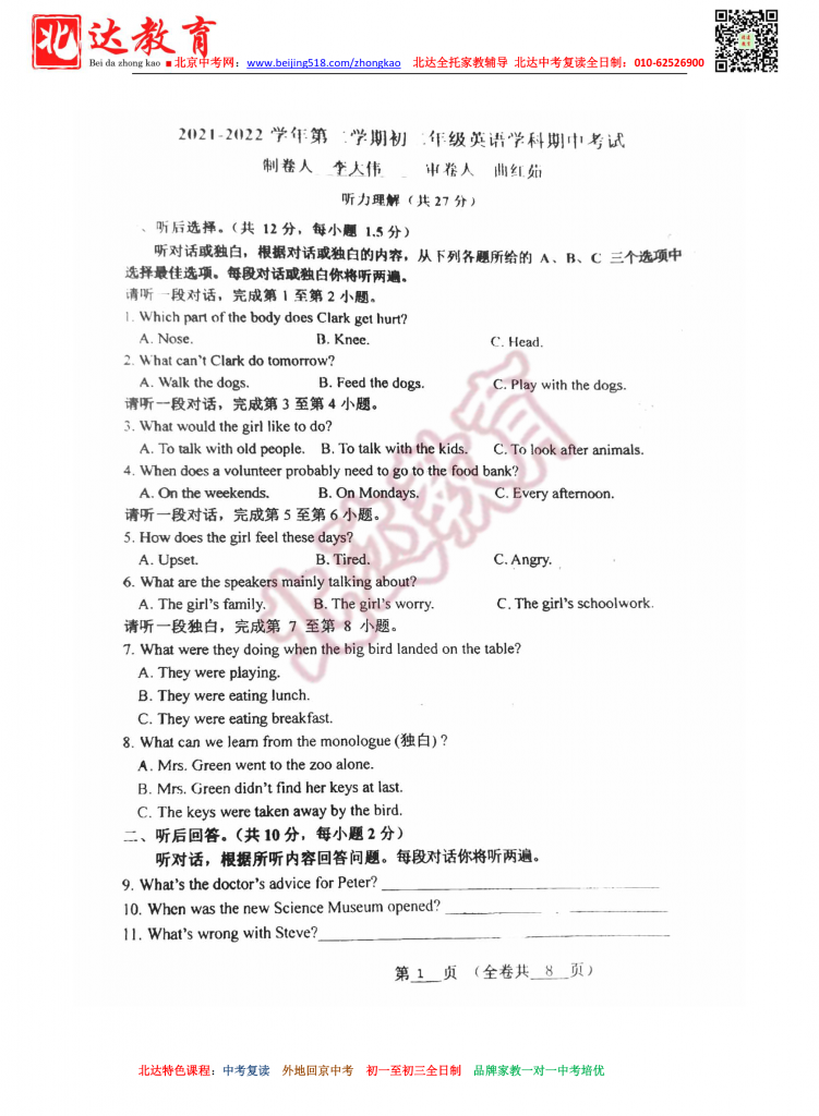 北京八一学校2022初二下期中英语试卷(高清版)。admw360中考复读学校教研组收集整理,分享给大家。