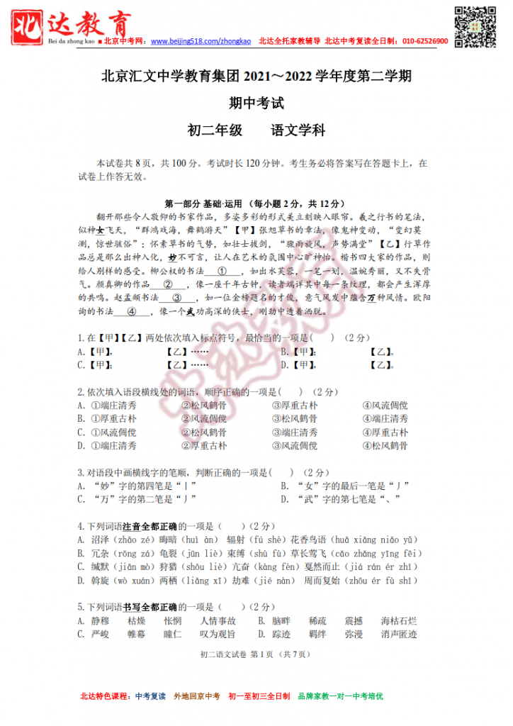 北京汇文中学2022初二下期中语文试卷(高清版)。admw360中考复读学校教研组收集整理,分享给大家。