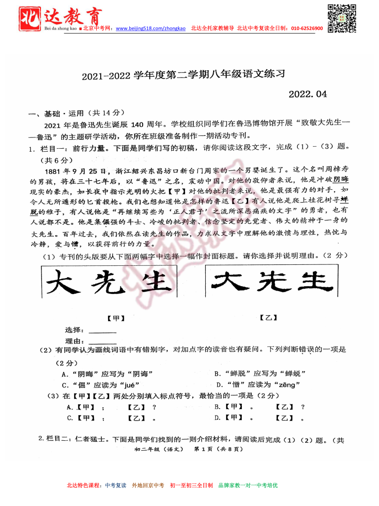 北京理工附中2022初二下期中语文试卷及答案(高清版)。admw360中考复读学校教研组收集整理,分享给大家。