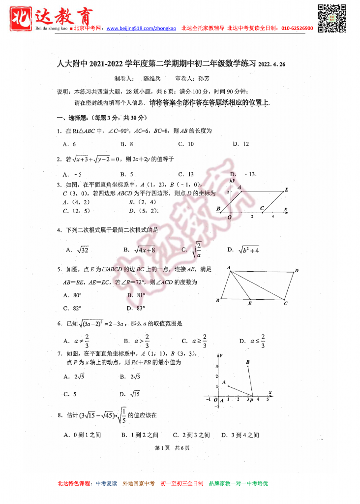 北京人大附中202204初二下期中数学试题(高清版)。admw360中考复读学校教研组收集整理,分享给大家。