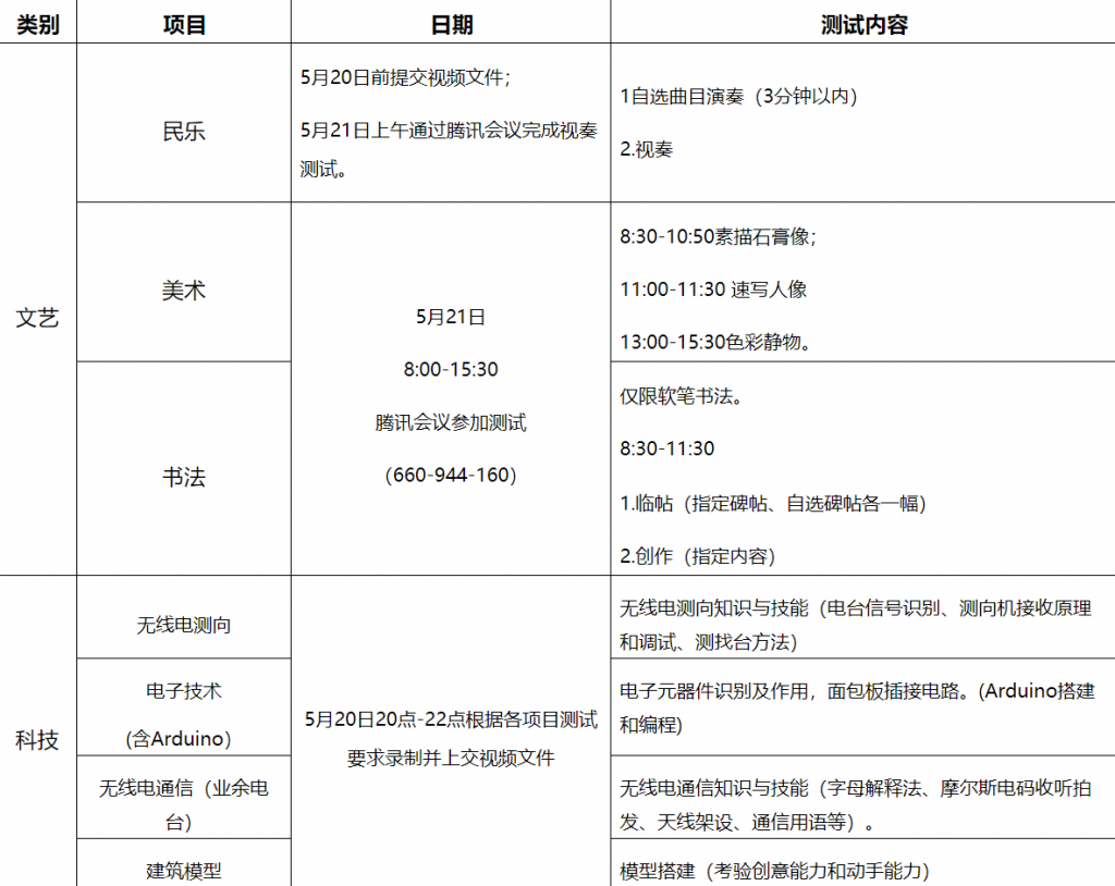 (1)招生范围:无线电测向、电子技术(含Arduino编程)、无线电通信、建筑模型。