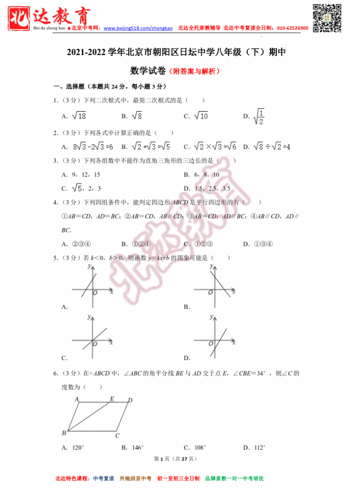 北京日坛中学2022初二下期中数学试题及答案(高清版)。admw360中考复读学校教研组收集整理,分享给大家。