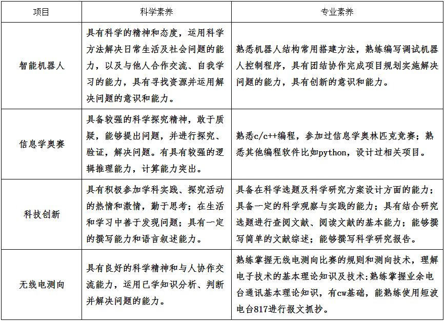 智能机器人、信息学奥赛、科技创新(包括金鹏科技论坛)、无线电测向(包括业余电台)。
