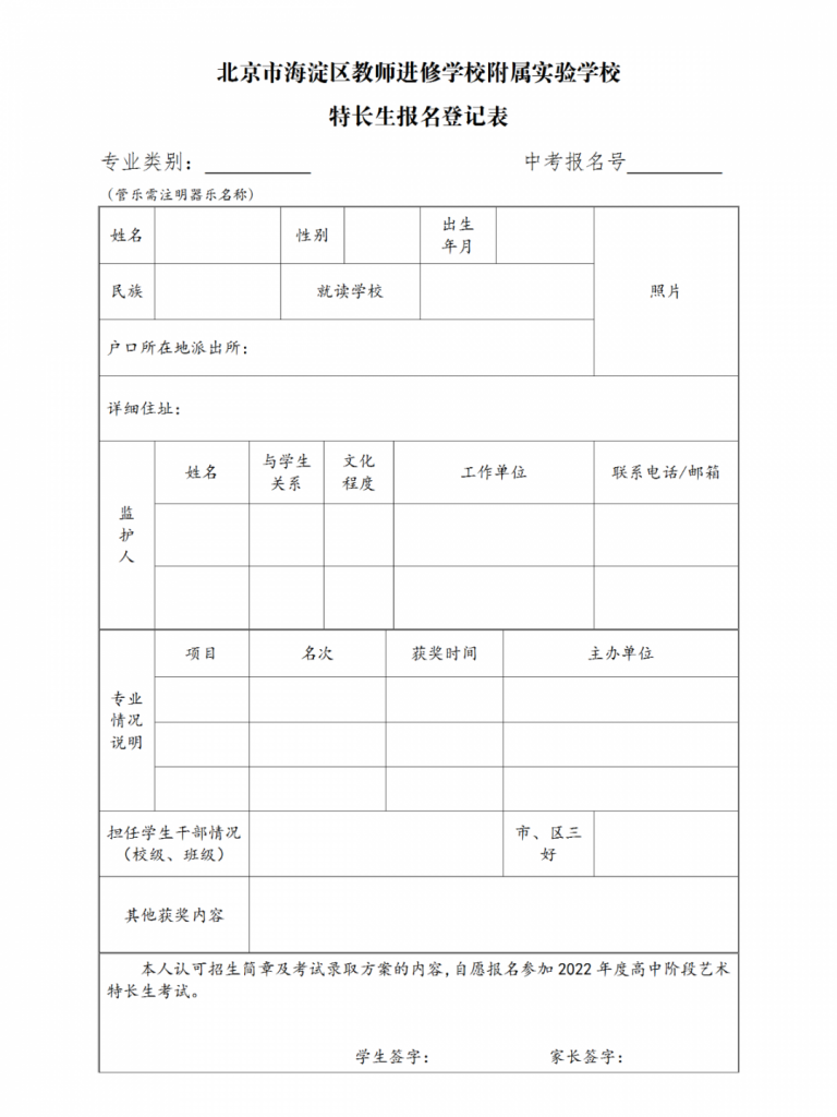 附件1《北京市海淀区教师进修学校附属实验学校特长生报名登记表》
