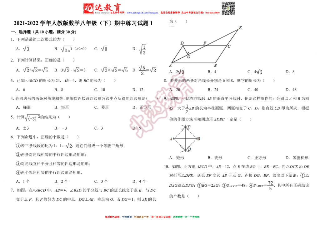 北京市平谷中学2022初二下期中数学练习试题1(高清版)。admw360中考复读学校教研组收集整理,分享给大家。