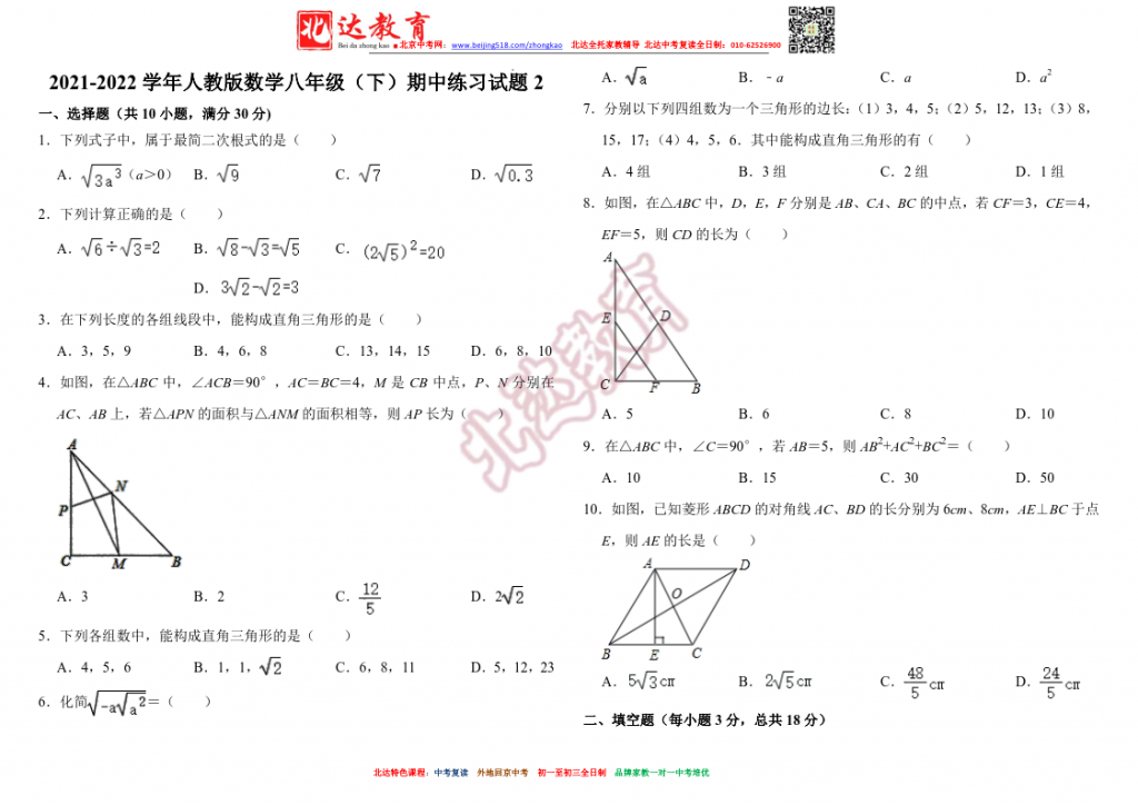 北京市平谷中学2022初二下期中数学练习试题2(高清版)。admw360中考复读学校教研组收集整理,分享给大家。