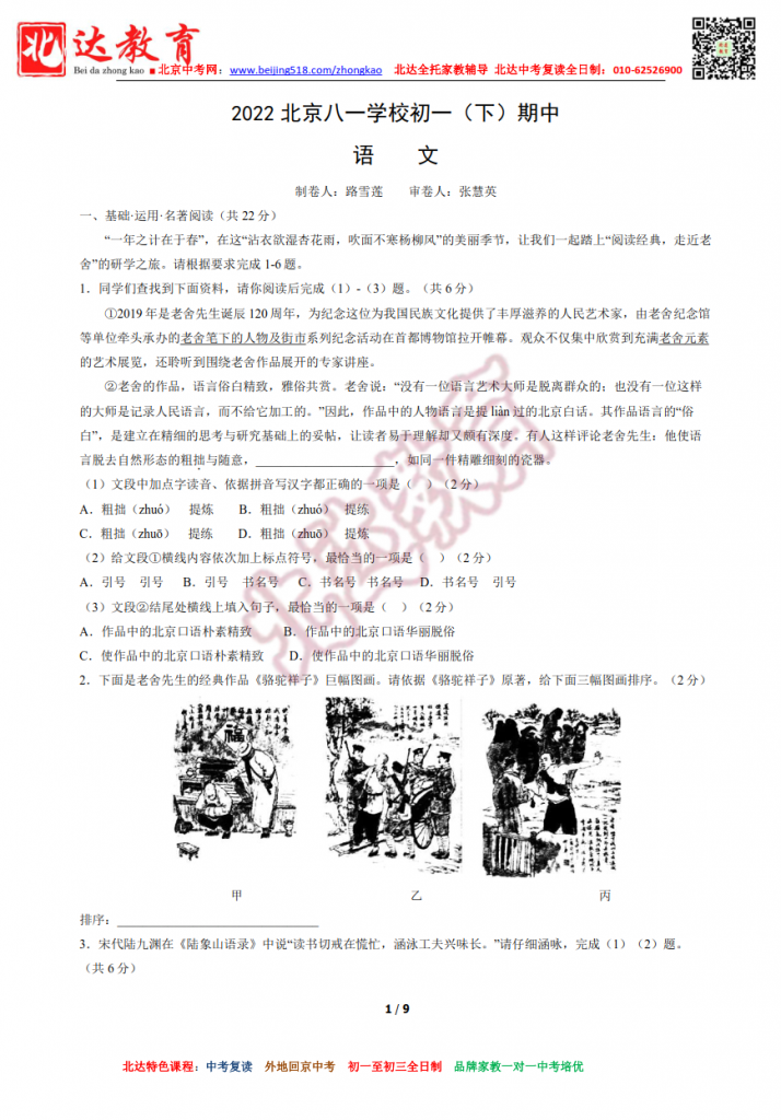 北京八一学校2022初一下期中语文试卷及答案(高清版)。admw360中考复读学校教研组收集整理,分享给大家。