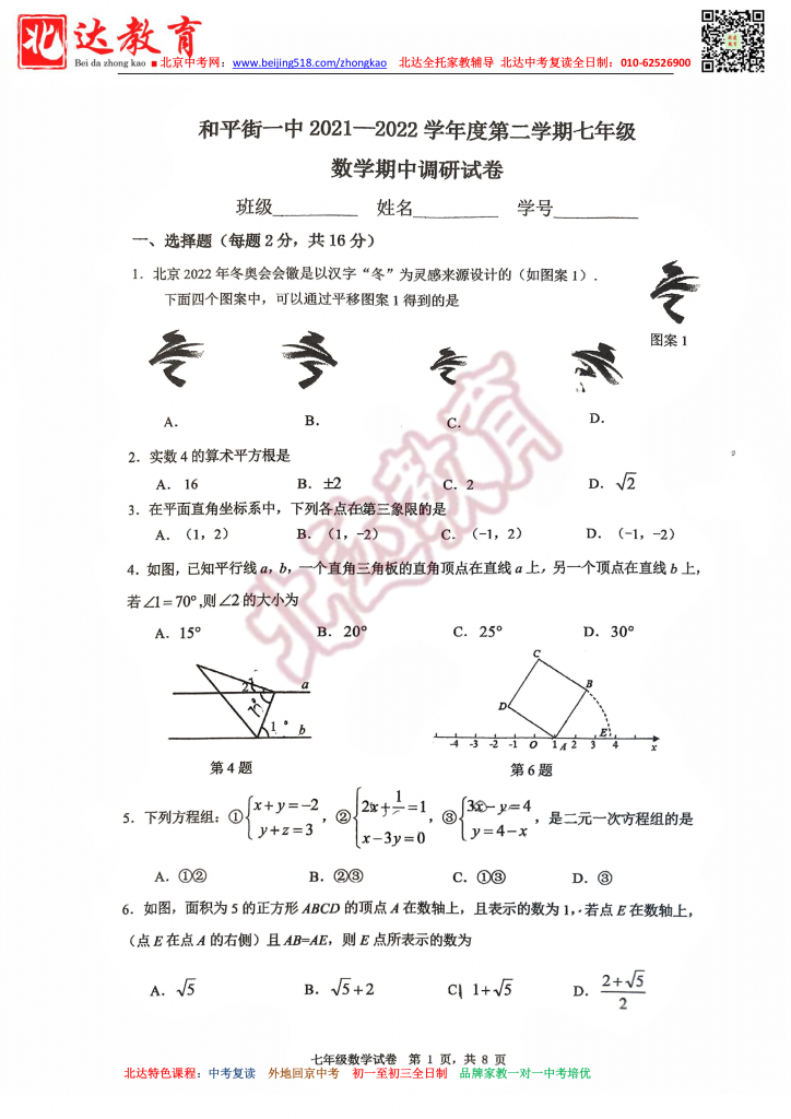 北京和平街一中2022初一下期中数学试卷(高清版)。admw360中考复读学校教研组收集整理,分享给大家。