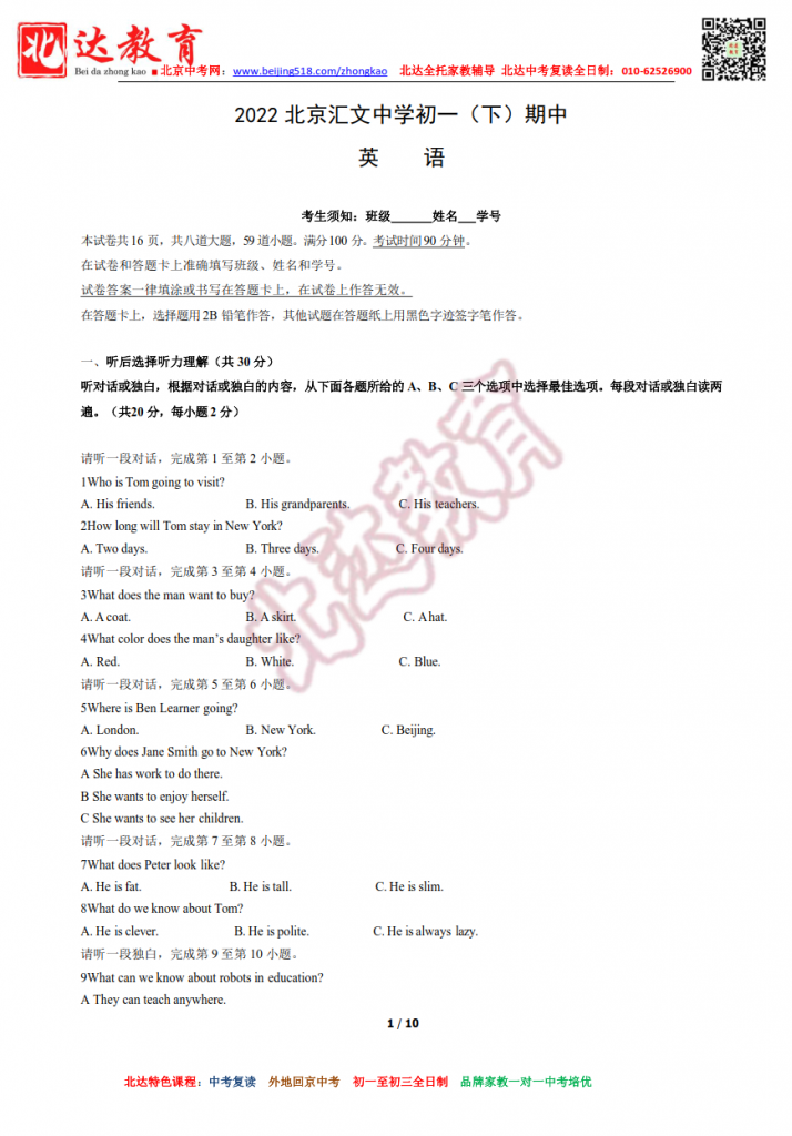 北京汇文中学2022初一下期中英语试卷及答案(高清版)。admw360中考复读学校教研组收集整理,分享给大家。
