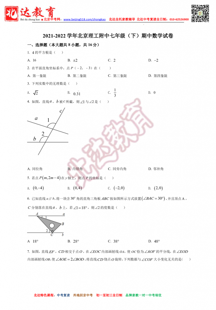 北京理工附中2022初一下期中数学试题及答案(高清版)。admw360中考复读学校教研组收集整理,分享给大家。
