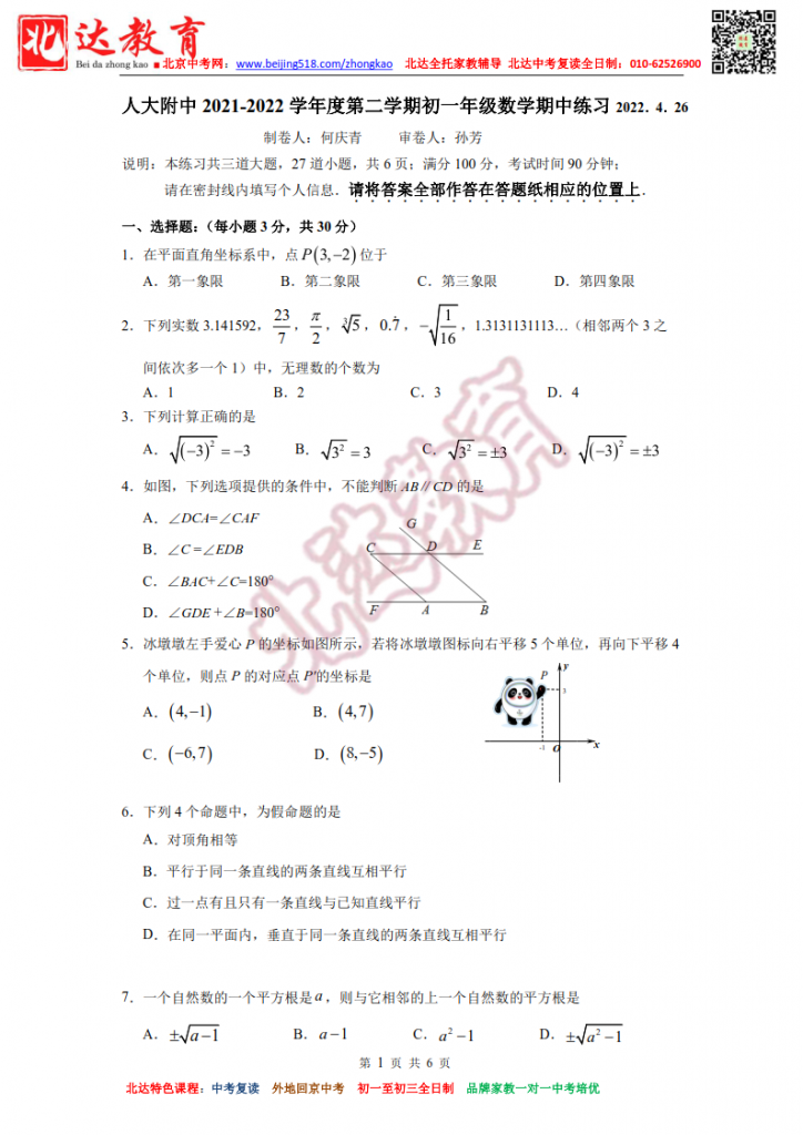 北京人大附中202204初一下期中数学试题及答案(高清版)。admw360中考复读学校教研组收集整理,分享给大家。