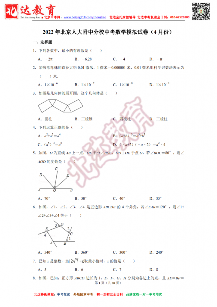 北京人大附中分校2022中考数学模拟试卷及解析(高清版)。admw360中考复读学校教研组收集整理,分享给大家。
