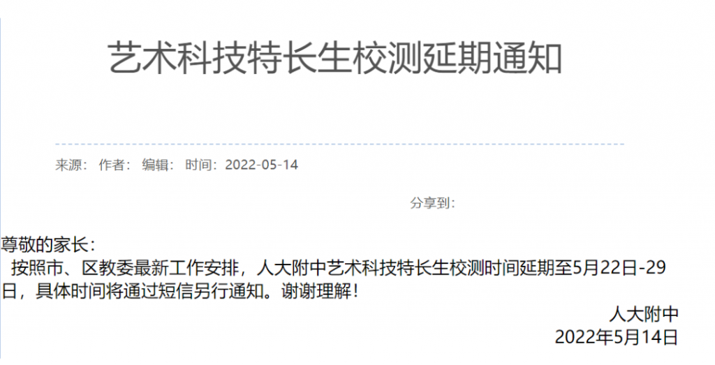 按照市、区教委最新工作安排,人大附中艺术科技特长生校测时间延期至5月22日-29日,具体时间将通过短信另行通知。谢谢理解!