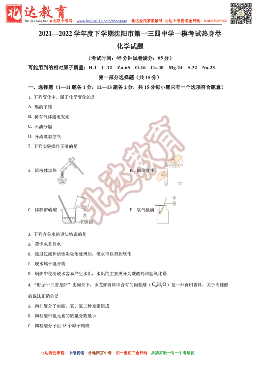 2022年辽宁省沈阳市第一三四中学中考一模化学试题