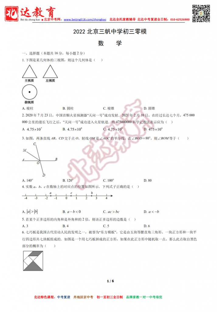 北京三帆中学2022初三零模数学试卷(高清版)。admw360中考复读学校教研组收集整理,分享给大家。