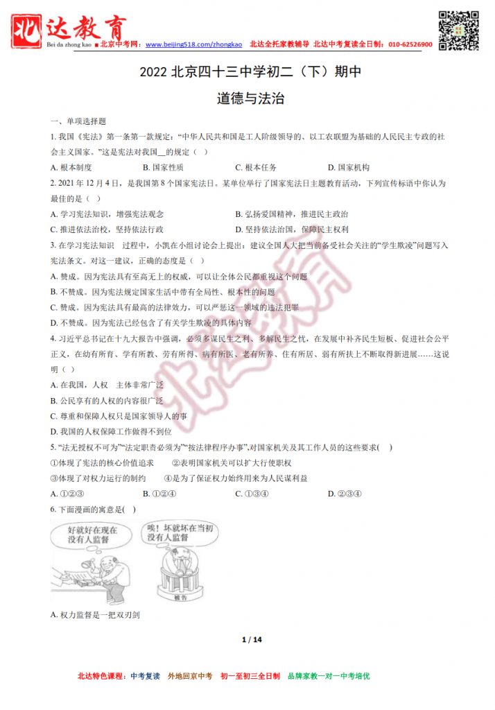 北京四十三中2022初二下道法试题及答案(高清版)。admw360中考复读学校教研组收集整理,分享给大家。