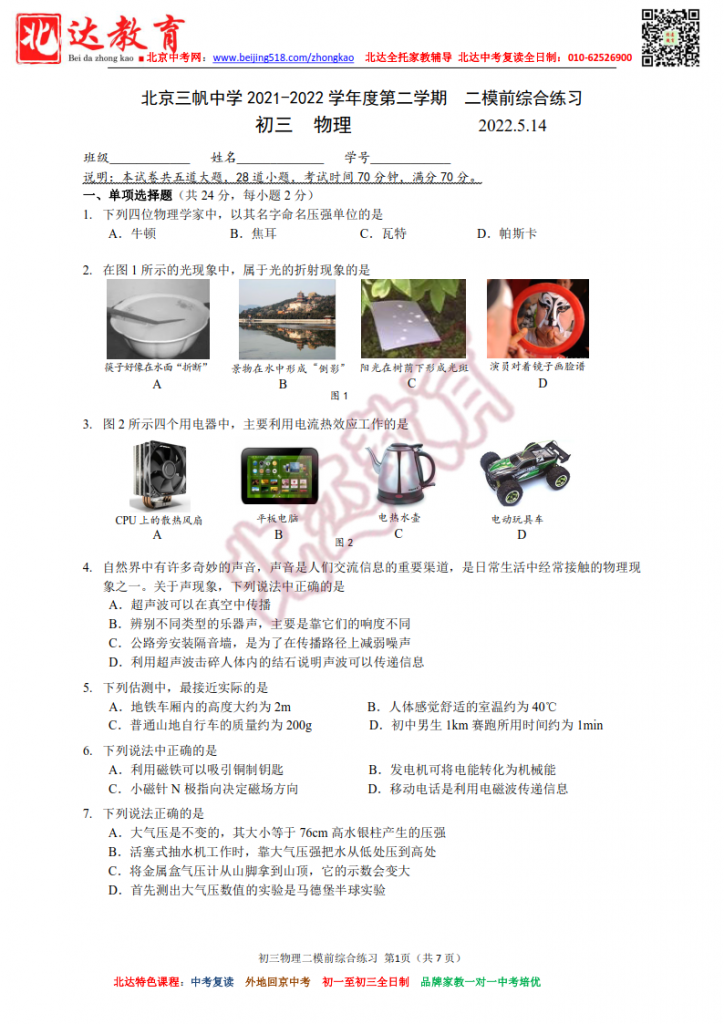 北京三帆中学202205初三二模前综合物理试题(高清版)。admw360中考复读学校教研组收集整理,分享给大家。