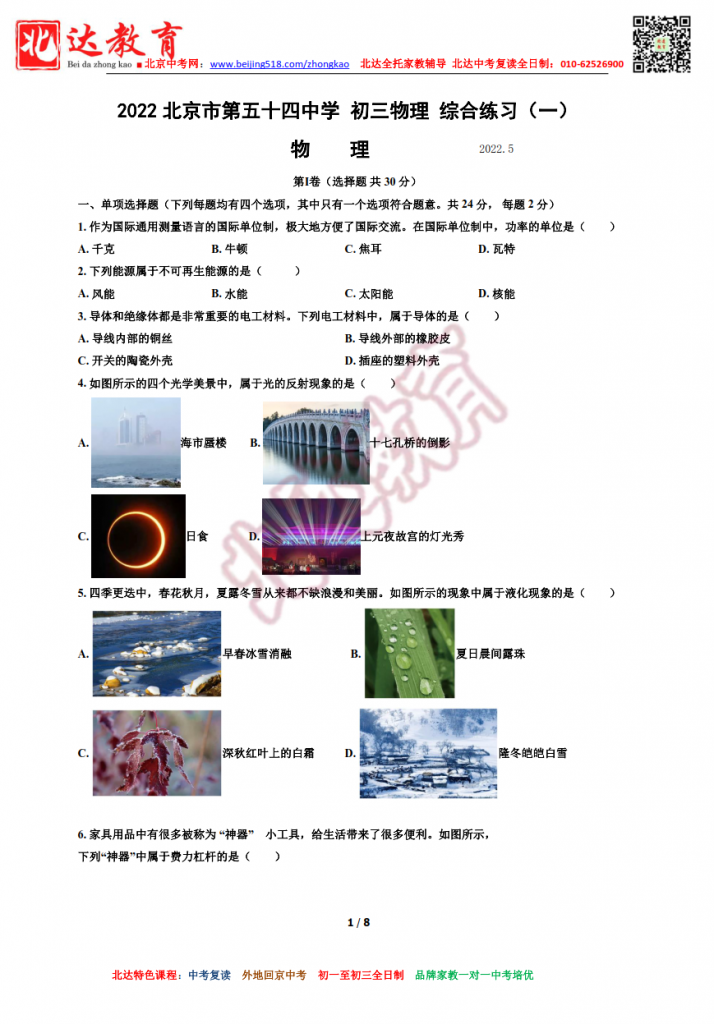 北京五十四中20220514初三物理综合练习(一)(高清版)。admw360中考复读学校教研组收集整理,分享给大家。