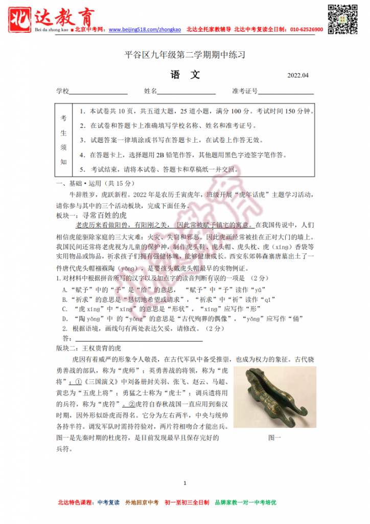 北京平谷2022初三一模语文试题(高清版)。admw360中考复读学校教研组收集整理,分享给大家。