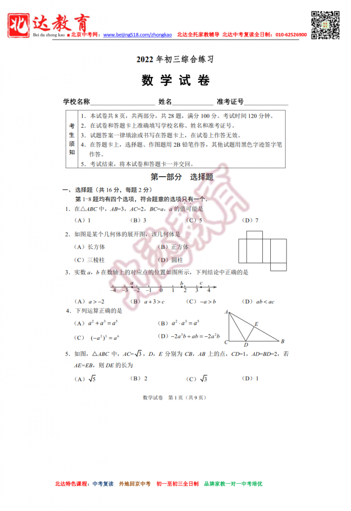 北京石景山2022初三一模数学试题及答案(高清版)。admw360中考复读学校教研组收集整理,分享给大家。