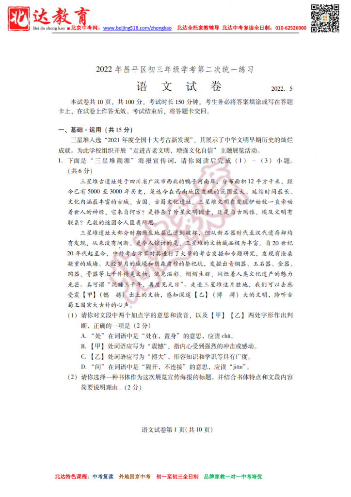北京昌平2022初三二模语文试卷及答案(高清版)!admw360中考复读学校教研组收集整理,分享给大家。