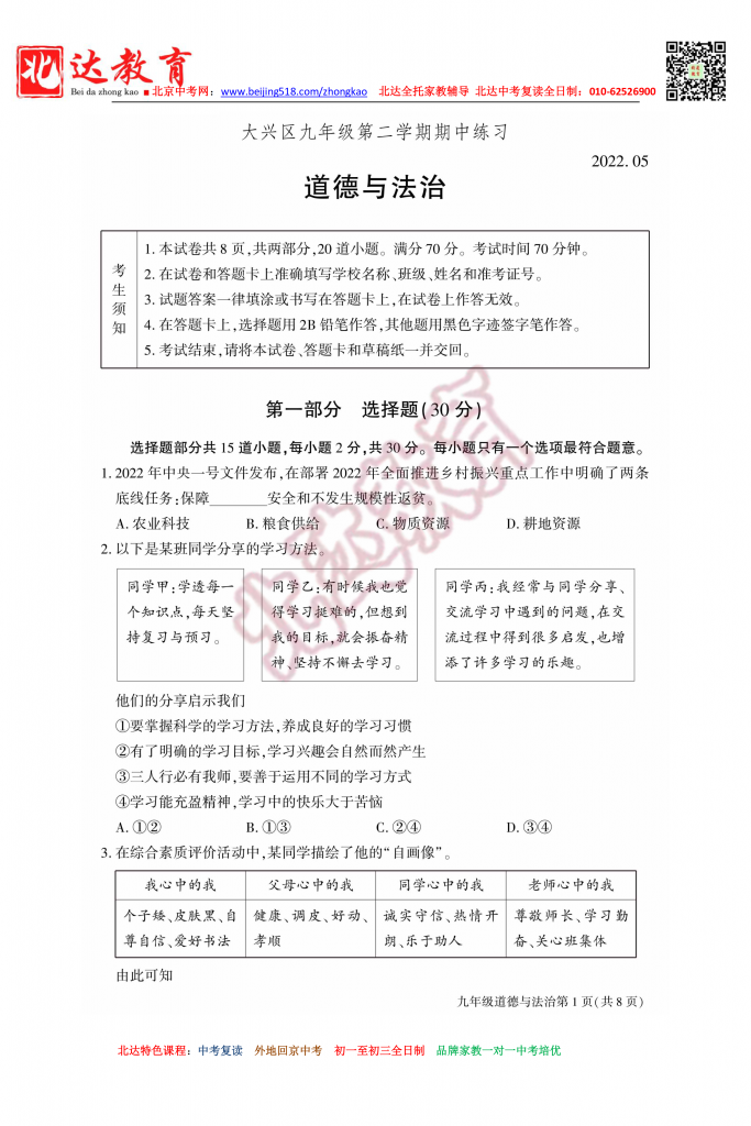 北京大兴2022初三一模道法试题及答案(高清版)。admw360中考复读学校教研组收集整理,分享给大家。