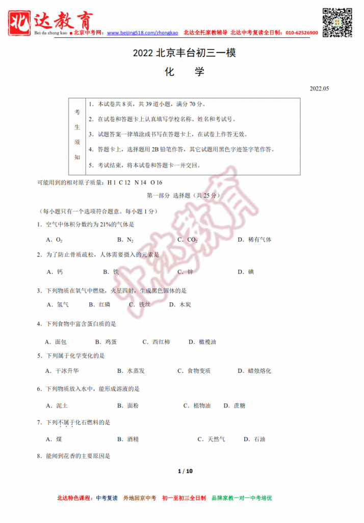 北京丰台2022初三一模化学试题及答案(高清版)。admw360中考复读学校教研组收集整理,分享给大家。
