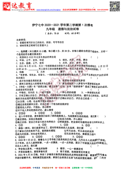 2022年新疆中考一模道德与法治试题及解析汇总。admw360教研组收集整理,分享给大家。