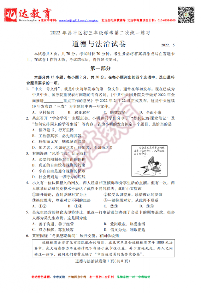 北京昌平2022初三二模道法试题(高清版)!admw360中考复读学校教研组收集整理,分享给大家。