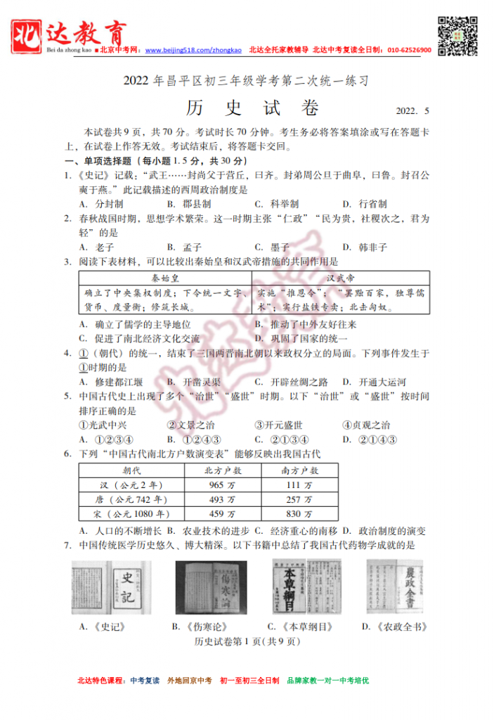 北京昌平2022初三二模历史试题(高清版)!admw360中考复读学校教研组收集整理,分享给大家。