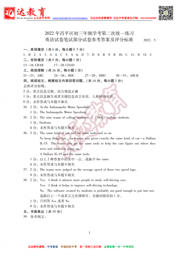 北京昌平2022初三二模英语答案(高清版)!admw360中考复读学校教研组收集整理,分享给大家。