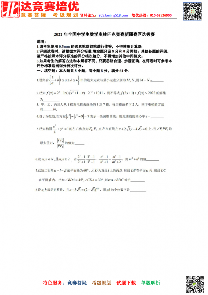 2022全国中学生数学奥林匹克竞赛新疆赛区选拔赛试题及答案(高清版)。admw360中考复读学校教研组收集整理,分享给大家。