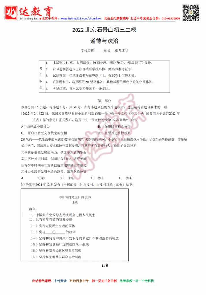 北京石景山2022初三一模道法试题及答案(高清版)。admw360中考复读学校教研组收集整理,分享给大家。