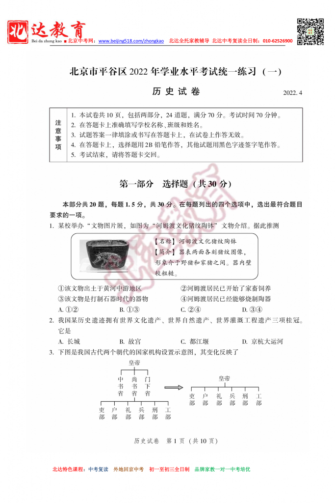 北京平谷2022初三一模历史试题及答案(高清版)。admw360中考复读学校教研组收集整理,分享给大家。