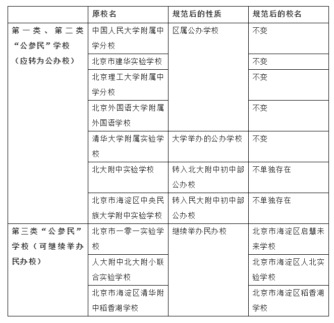 海淀区有丰富多元的民办教育资源。该区严格按照教育部文件对“公参民”学校的认定标准开展工作,制定了总体工作方案和具体工作指南,确定有7所需要调整办学性质的民办学校。其中,清华附属实验学校将转为大学举办的公办学校,民大附中实验学校、北大附中实验学校将分别转入由大学举办的民大附中和北大附中2所公办校。人大附中分校、北外附校、建华实验学校、理工附中分校4校将转为区属公办学校,校名不变。