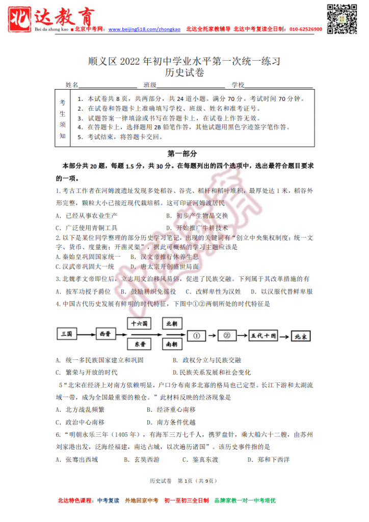 北京顺义2022初三一模历史试题及答案(高清版)。admw360中考复读学校教研组收集整理,分享给大家。