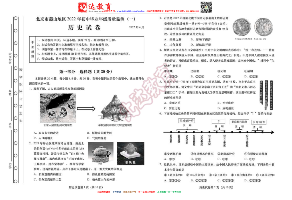 北京燕山2022初三一模历史试卷(高清版)。admw360中考复读学校教研组收集整理,分享给大家。