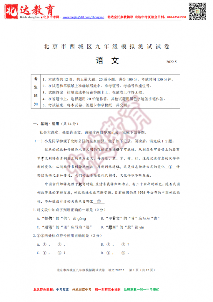 北京西城2022初三二模语文试题及答案(高清版)!admw360中考复读学校教研组收集整理,分享给大家。