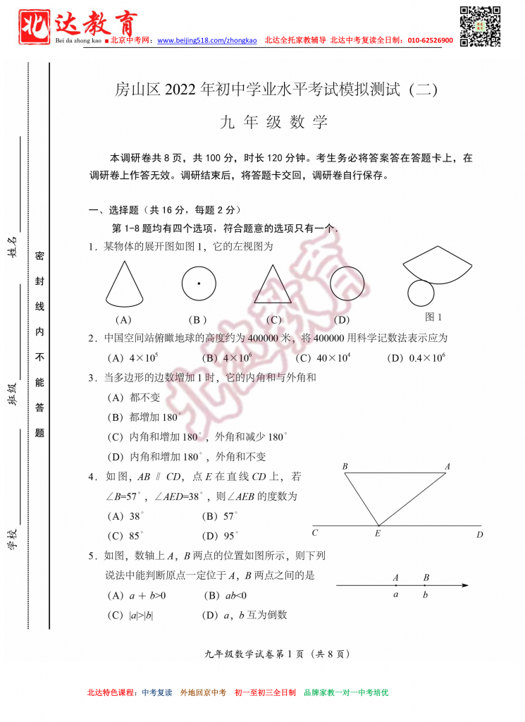 北京房山2022初三二模数学试题及答案(高清版)!admw360中考复读学校教研组收集整理,分享给大家。