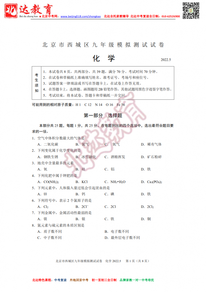 北京西城2022初三二模化学试题及答案(高清版)!admw360中考复读学校教研组收集整理,分享给大家。