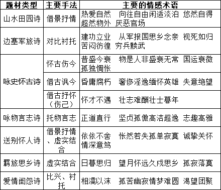 4、内容情感:①羁旅孤凄之愁;②恋家怀人之思;③怀才不遇、报国无门之怨;④年华易逝之悲;⑤厌战思亲之情。