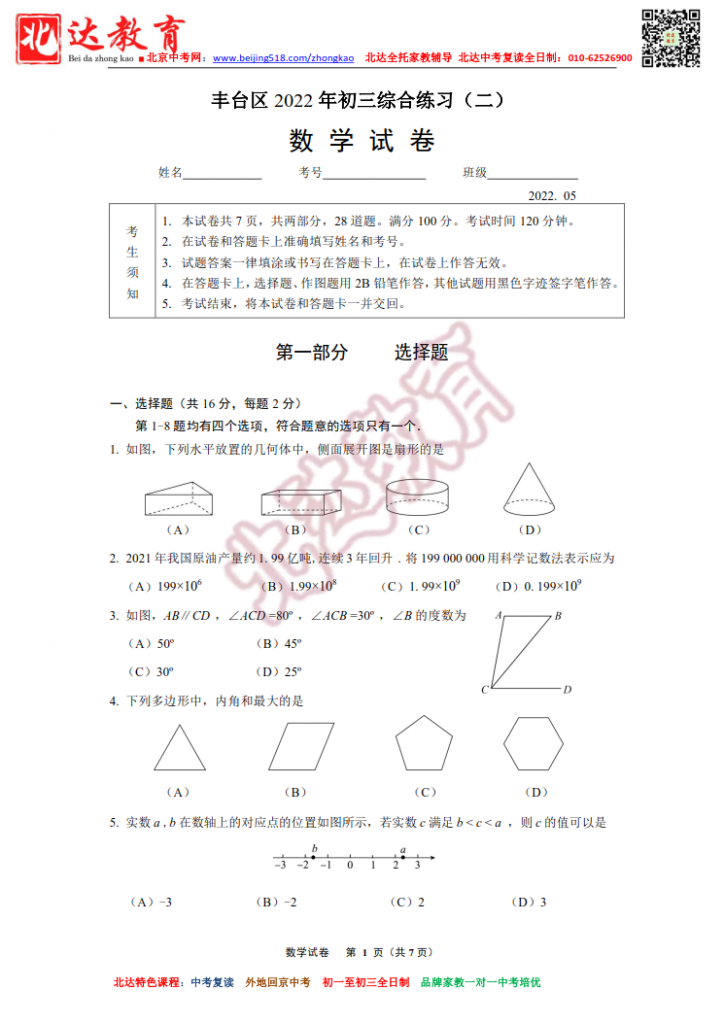 北京丰台2022初三二模数学试题及答案(高清版)!admw360中考复读学校教研组收集整理,分享给大家。