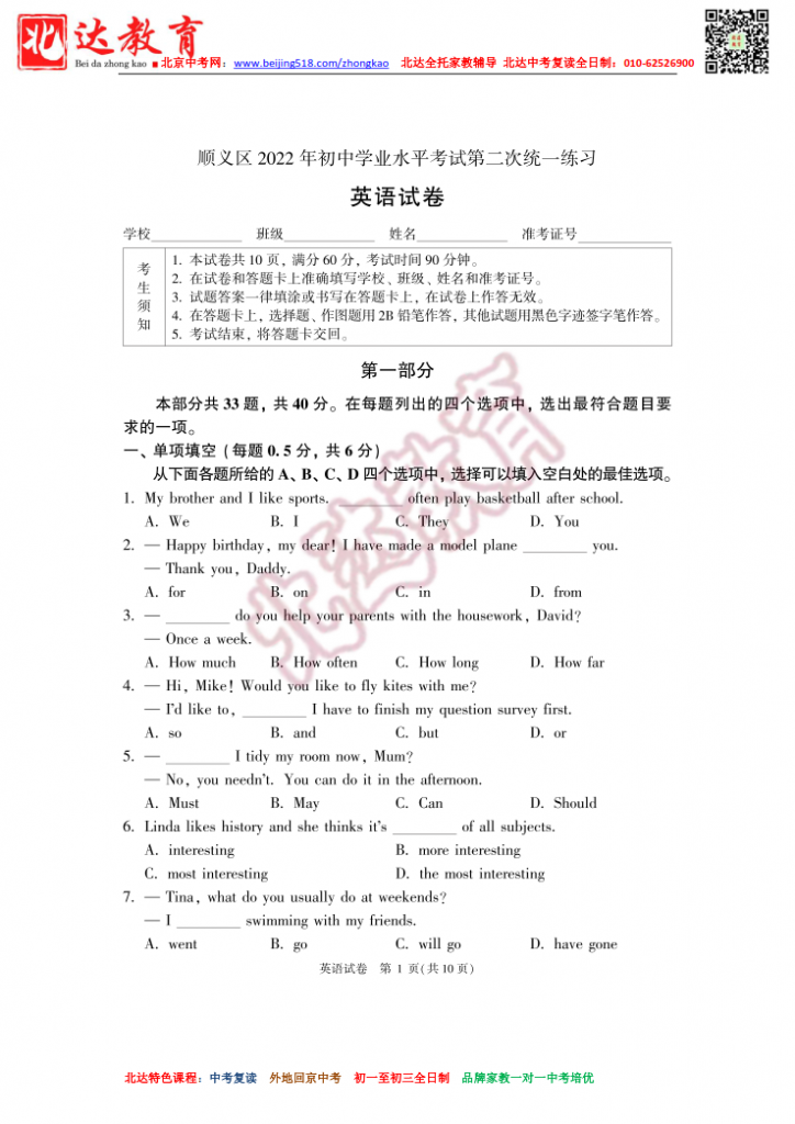 北京顺义2022初三二模英语试题及答案(高清版)!admw360中考复读学校教研组收集整理,分享给大家。