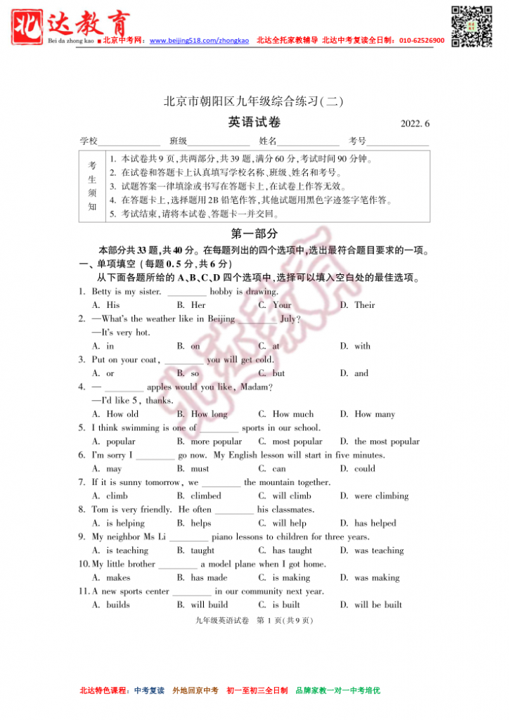 北京朝阳2022初三二模英语试题及答案(高清版)!admw360中考复读学校教研组收集整理,分享给大家。