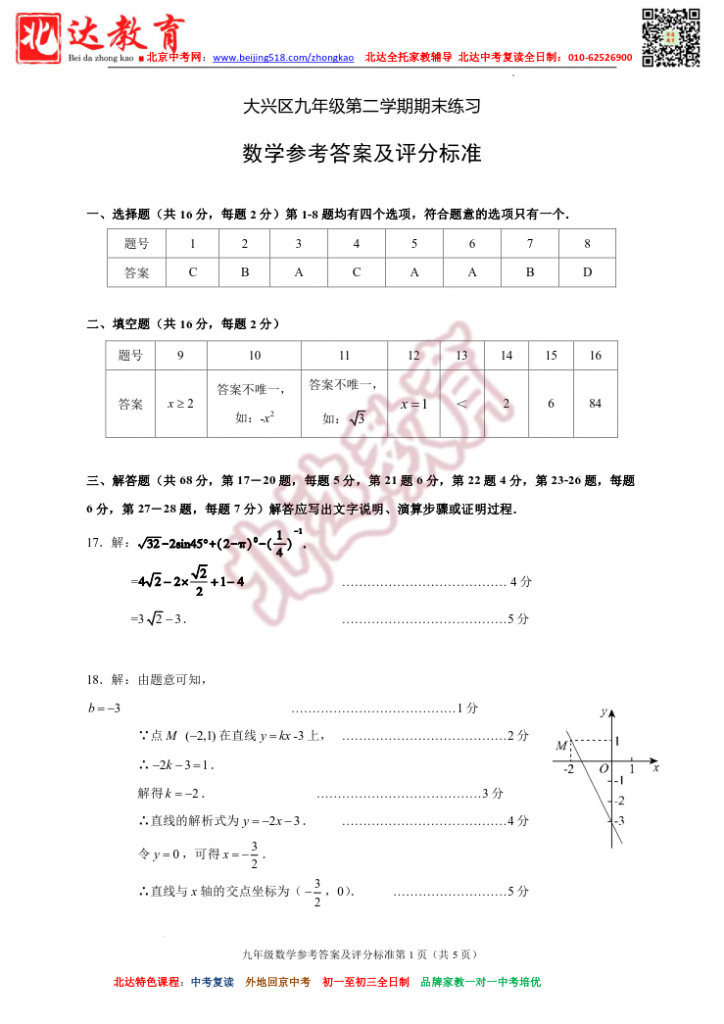 北京大兴2022初三二模数学答案(高清版)!admw360中考复读学校教研组收集整理,分享给大家。